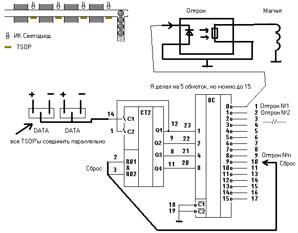 Гаусс на оптронах.![]() Еще не помешает запихнуть оптику внутрь катушек. Катушки я брал готовые иоптику пришлось ставить рядом, но все равно работало. Оптроны пойдут любые,выбирать в зависимости от катушек. Схема может работать вообще без кондеров,но тогда нужен злой источник питания. Если приделать подачу патронов, тобудет стрелять очередями :) Я много с этим гауссом не экспериментировал,кончилось все когда сгорели оптроны. Теоретически можно ставить и обычныерелюхи. Время их отставания компенсируется сдвигом оптики, но я это непроверял.